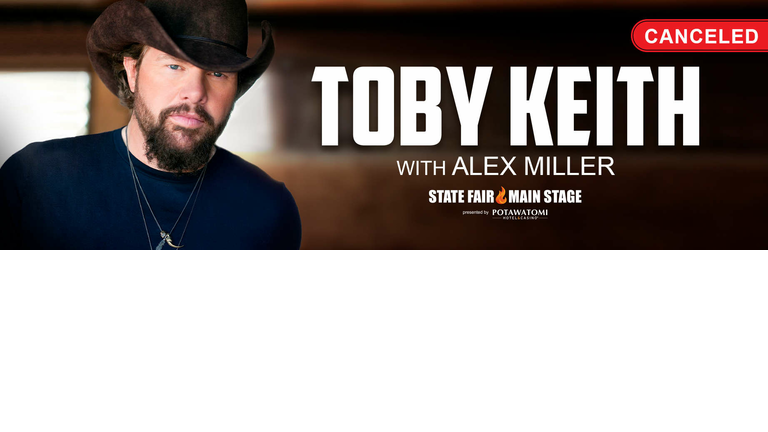 **THIS SHOW HAS BEEN CANCELED** Toby Keith With Alex Miller Wisconsin State Fair Main Stage Thursday, August 4, 2022 Tickets on sale Thursday, 4/7/22 at 9:00am. Click HERE to purchase.